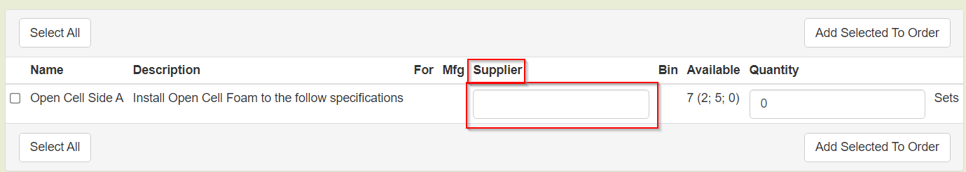 Next you will need to select the items you’d like to add to your work order. You will nee to make sure you are inputting which supplier these materials are coming from. A default supplier can be added to all your items, so that when you create Stock orders this field is prefilled in.