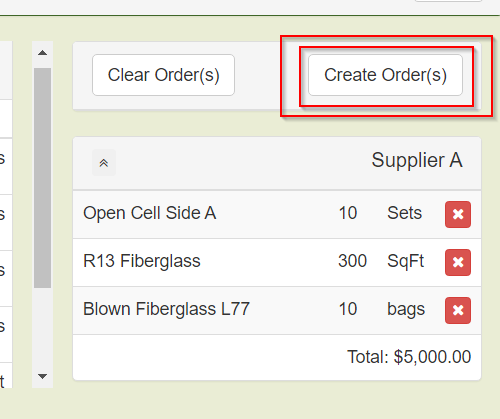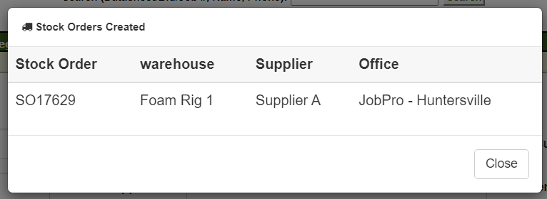 Once all your items are added, click create order. From there a pop-up window will appear that contains the stock order number. You can click this pop up and it will redirect your browser to the Stock Order page where you can receive the materials.
