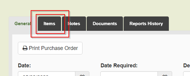 Once on the stock order page, you will need to click the items tab to receive the material.