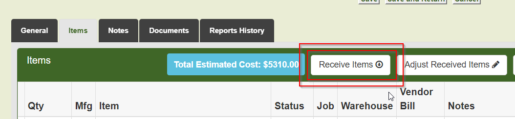 Click the ‘Receive items’ button to receive the items from this order. From here you will be able to adjust any pricing and quantities on the items you are receiving.