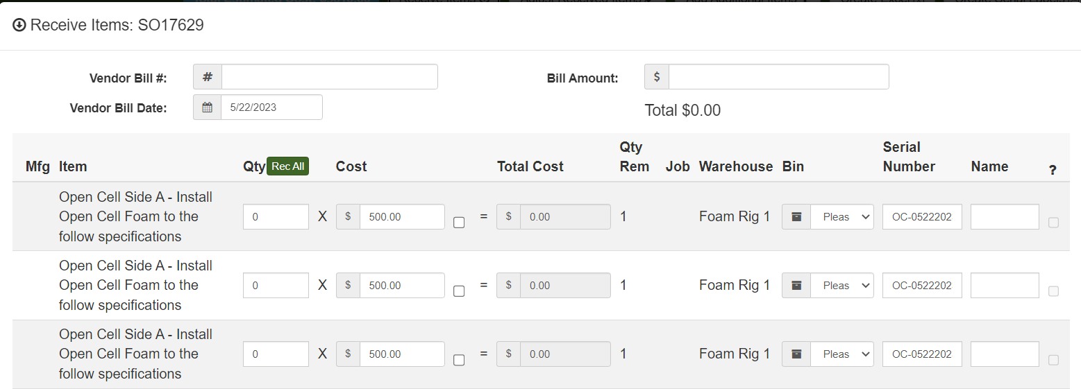 You will need to type in a vendor bill number and the total amount of the material you are receiving.