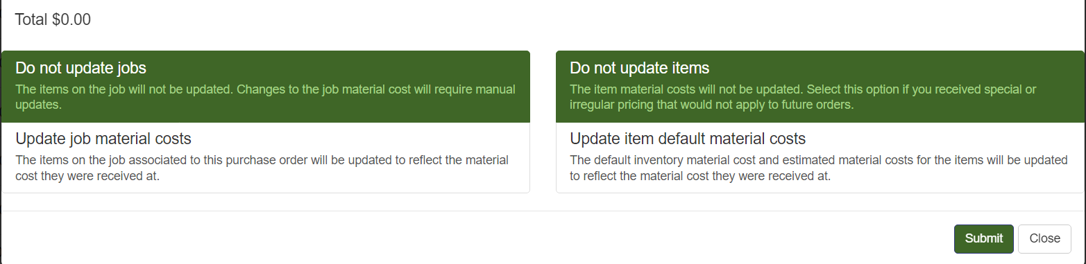 The update buttons at the bottom of this screen are different actions in the system. The only button that will make any updates to your system when receiving a stock order is the update default items material cost button. If you are receiving a price change from a vendor and need to update the cost in the system for that item, when receiving the material make sure this option is selected so that the base items Inventory costs change as well.