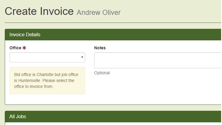 At times in the system, the office notated on the bid and the office notated on the job may be different. This could be by your company’s workflow for a particular customer, but it could also be a user error.