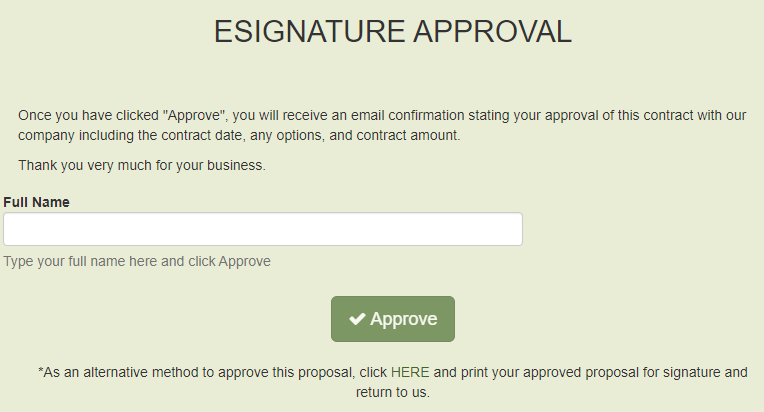 Once they have reviewed their proposal and chosen any available options, they will be taken to the eSign approval page where they will enter their ‘Signature’ by typing their full name in the text box and clicking ‘Approve’