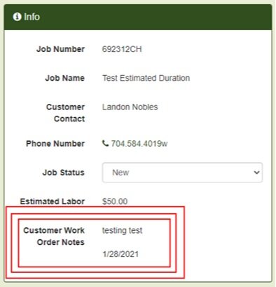 Previously, there was not a location on the tech app that displayed the ‘Work Order Notes’ located on the Customer page. Now, JobPro has updated the system to have this information display in the information field labeled ‘Info’ on the Information tab of the job.