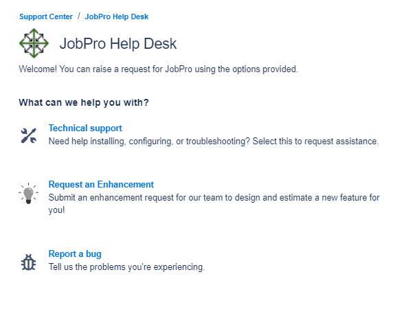 Welcome to the JobPro Technology Help Desk Page. Here you will find information about how to submit tickets to the help desk and make use of the support portal.