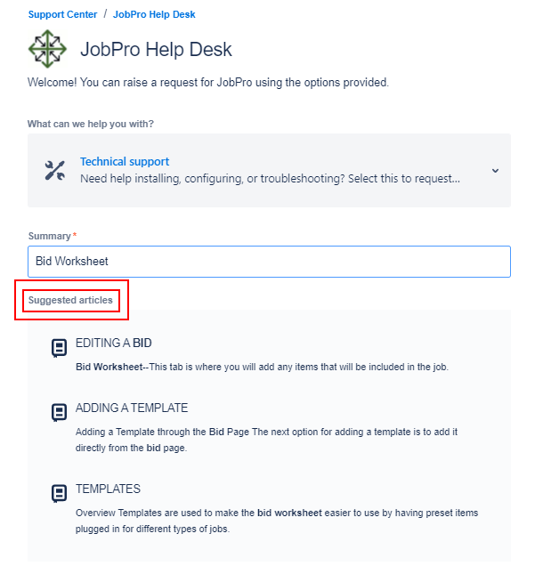 Based on the text entered into the Summary field while submitting a request, the portal will offer suggested articles that may be helpful. These will display below the Summary field and can be selected to view.