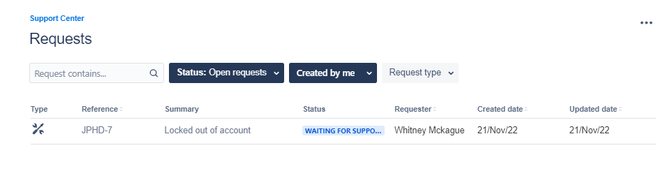 You will be taken to a page that lists any open requests. You can use the status filter to view tickets in a specific status. You can also filter by request type or based on tickets created by you, others, or shared with your organization.