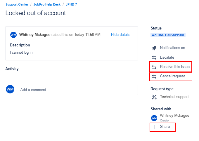 Select the reference number to open the ticket. This is where you will see an overview of the ticket, the status, any comments made by a JobPro Support engineer or anyone with access to the ticket. At anytime, you can add a comment and a support engineer will be notified. You also have the option to resolve, cancel, or share this issue.
