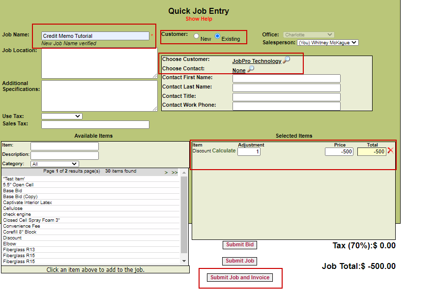 When you have entered all the necessary information, click ‘Submit Job and Invoice’ (Invoicing the job with a negative total is what creates the credit memo. So you could click ‘Submit Job’ and then Invoice later, but clicking Submit Job and Invoice is the quickest way to create this memo.)