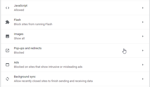 in the ‘Pop-Ups’ section, click ‘Pop-ups and redirects’