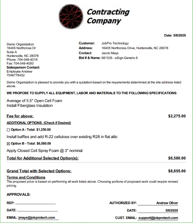 An exciting update is now available regarding your customer experience with the eSign page in JobPro. With this update, when your customer clicks the eSign link in the email, they will be able to view an interactive proposal. This interactive proposal allows the customer to actively check options and view the job total update on the proposal.