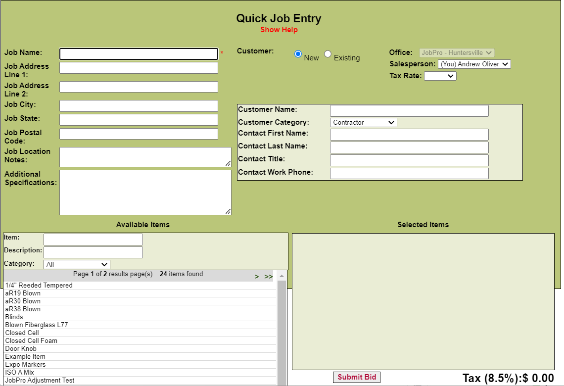 Now add the items that the job requires and fill out the information in the Selected Items pane.