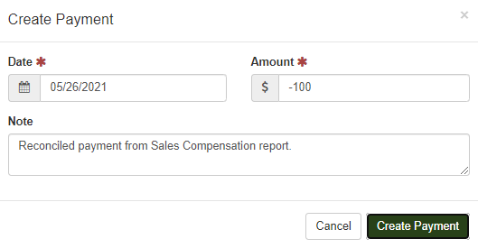 The Sales Compensation Report allows you to view your sales people’s commission compensation. You are able to see a starting balance, commissions earned, commissions aged out, payments, and their balance owed. If there is a balance owed to your employees you can create a payment right from this report.