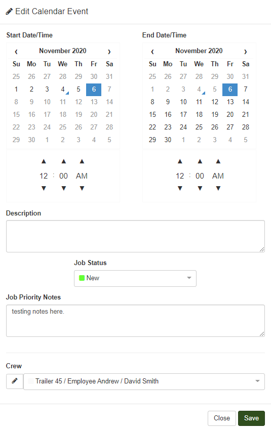 Now you can enter a start and end date, a description of the job, change the job status, add job priority notes, and add/edit a crew.