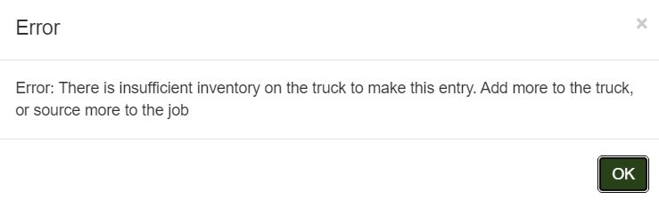 Just to note, the system will not allow you to enter more material on the Job Processing tab than has been loaded to your equipment. If you enter more than you have loaded, an error message will appear. If you need to enter this larger number, you will need to return to the Daily Inventory Management screen and load more material on this truck for this install date
