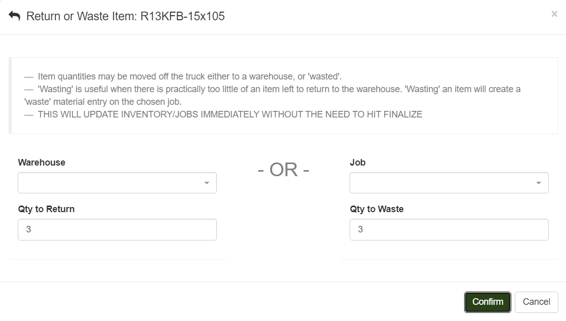 Click the arrow icon on the item you need to reconcile. A pop-up window will appear where you can choose to return this item to the warehouse or waste it to the job. Wasting an item to the job allows you to account for the cost of this material directly onto the job.